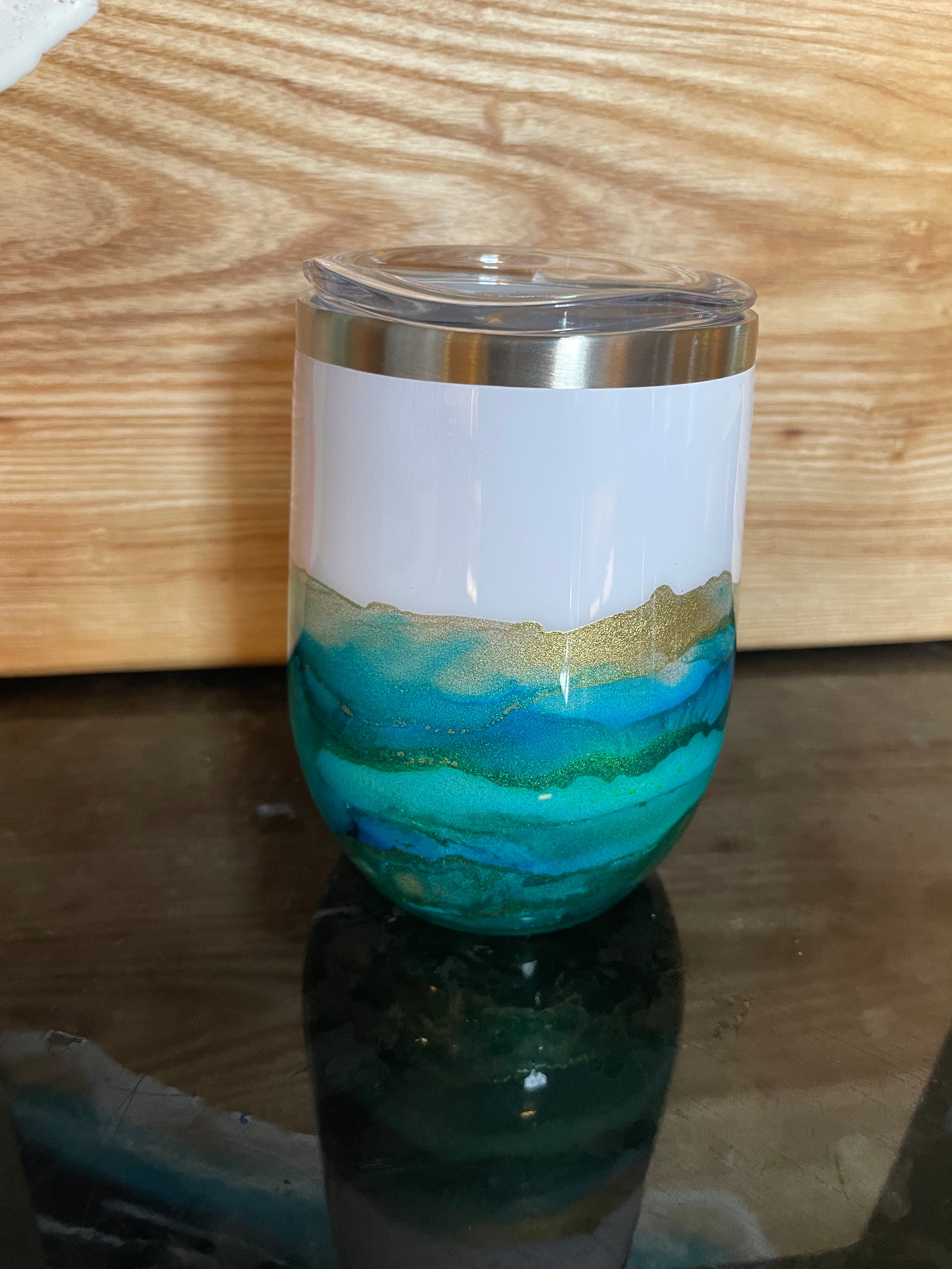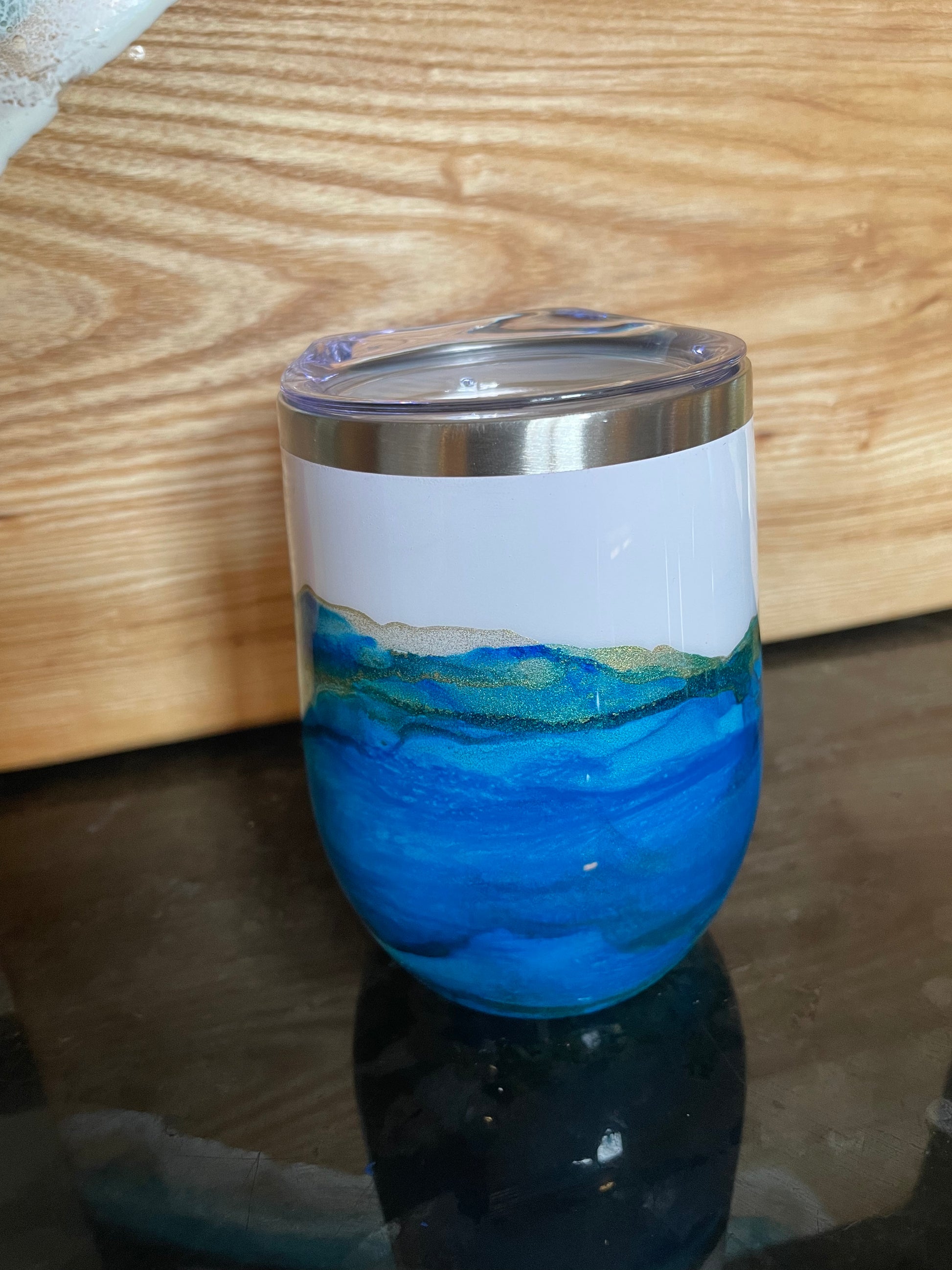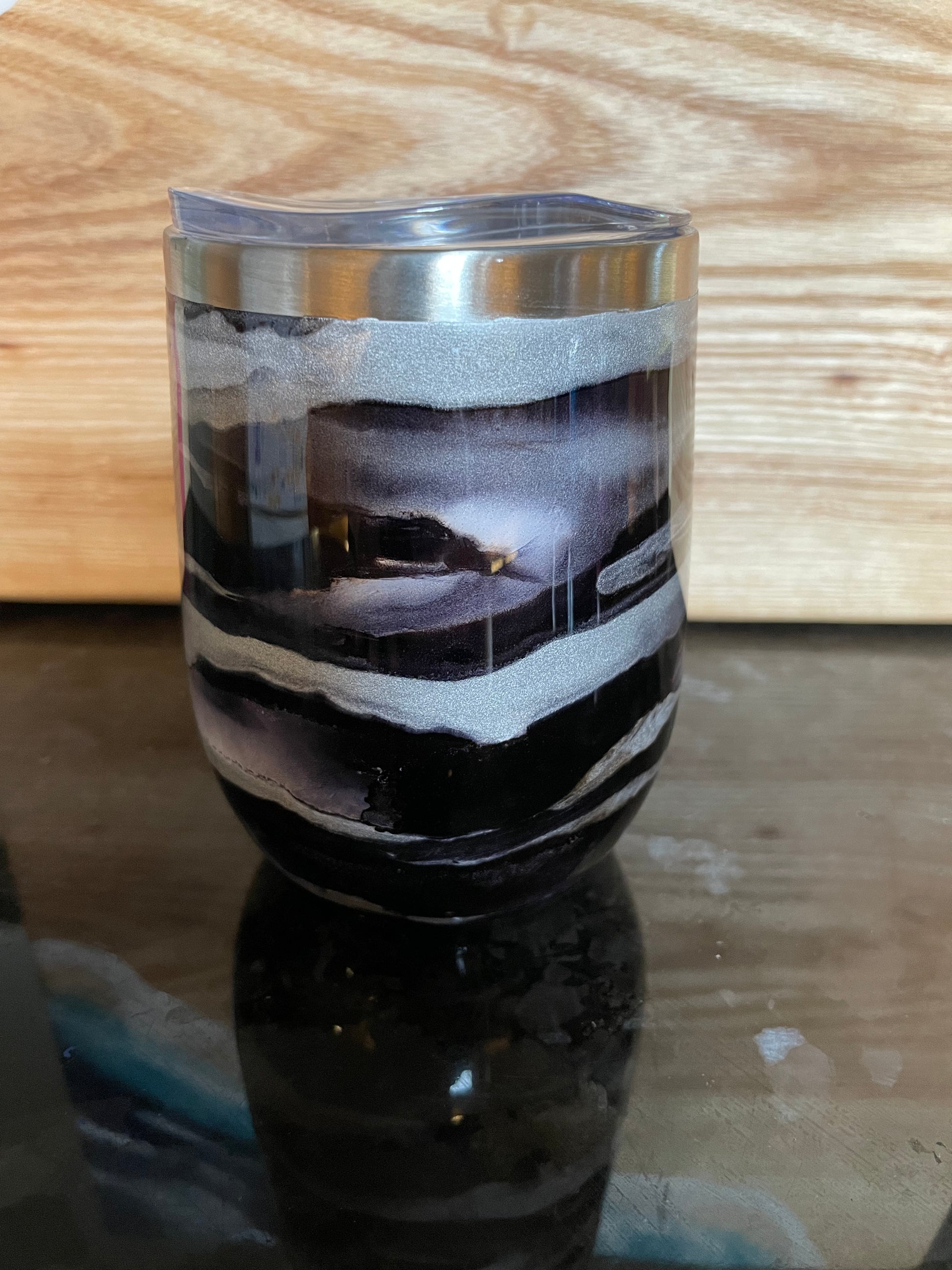 Stainless steel 12oz tumbler for hot or cold drinks.