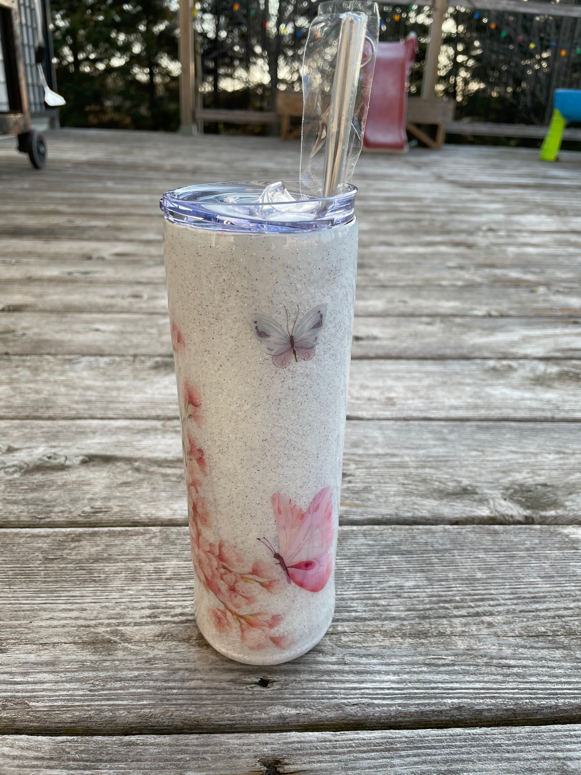 If purchased when sold out a custom order will be requested and takes 10-20 business days to complete plus shipping. Butterflies will be pink pastel & selected at random to complement the tumbler & flowers.