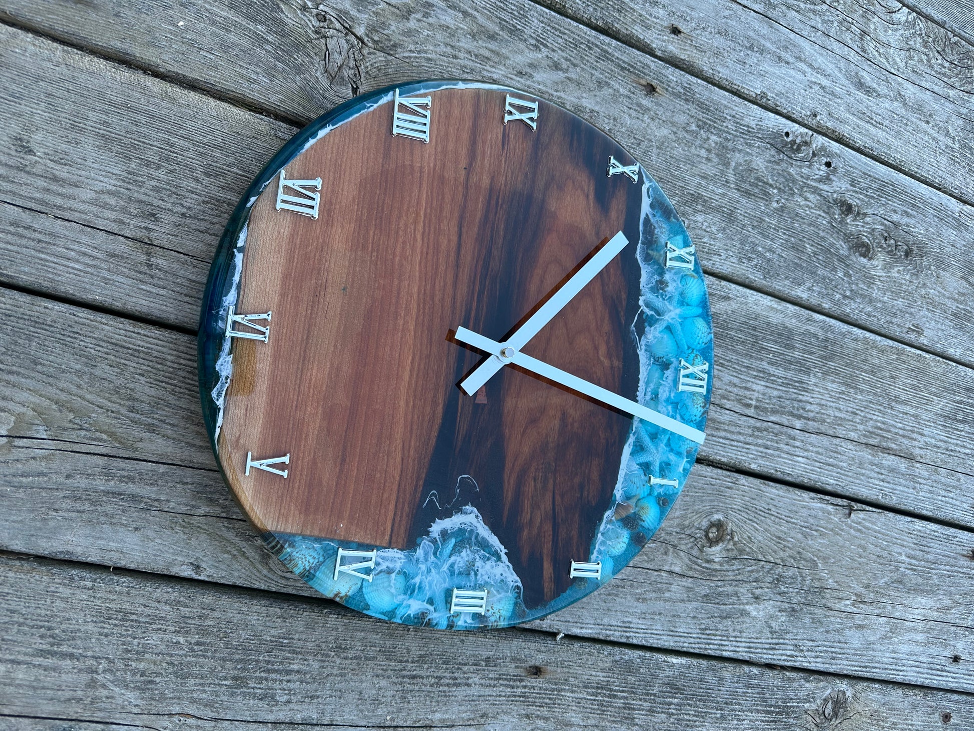 This stunning live edge cherry wood with ocean epoxy accents is ready to accent your space. A beautiful functional art piece.