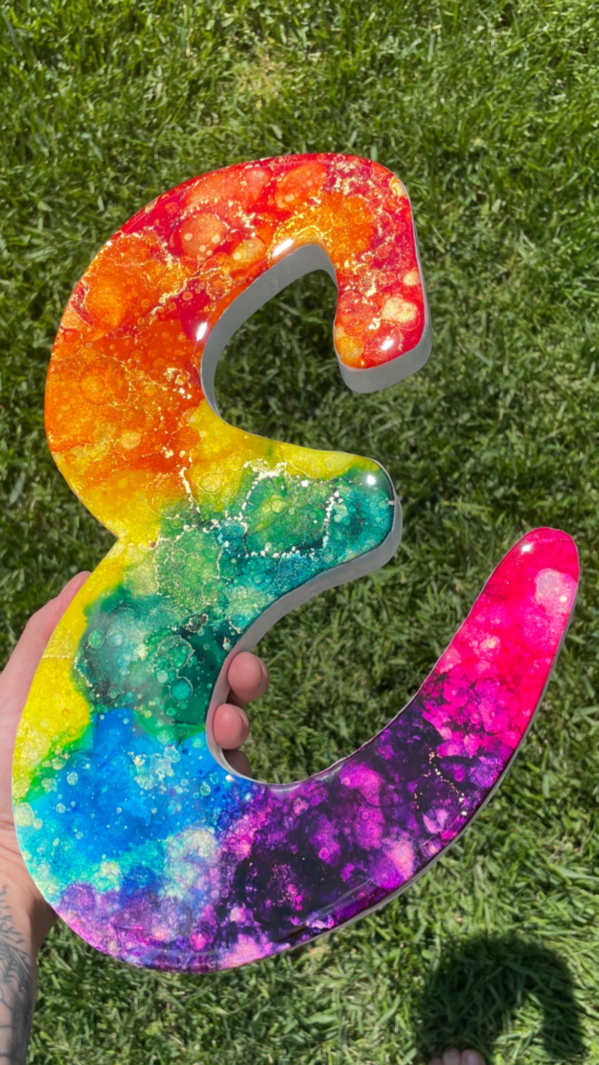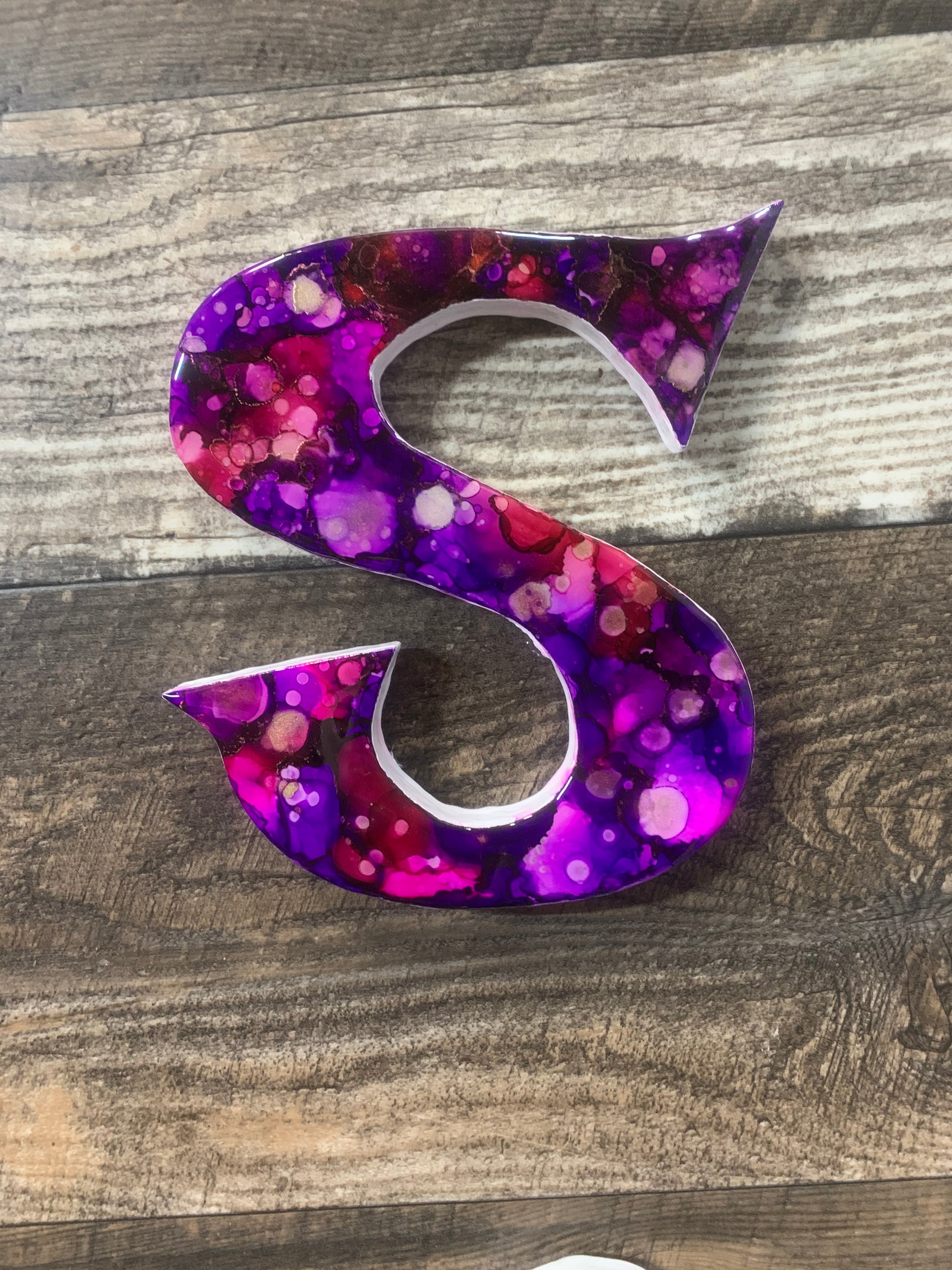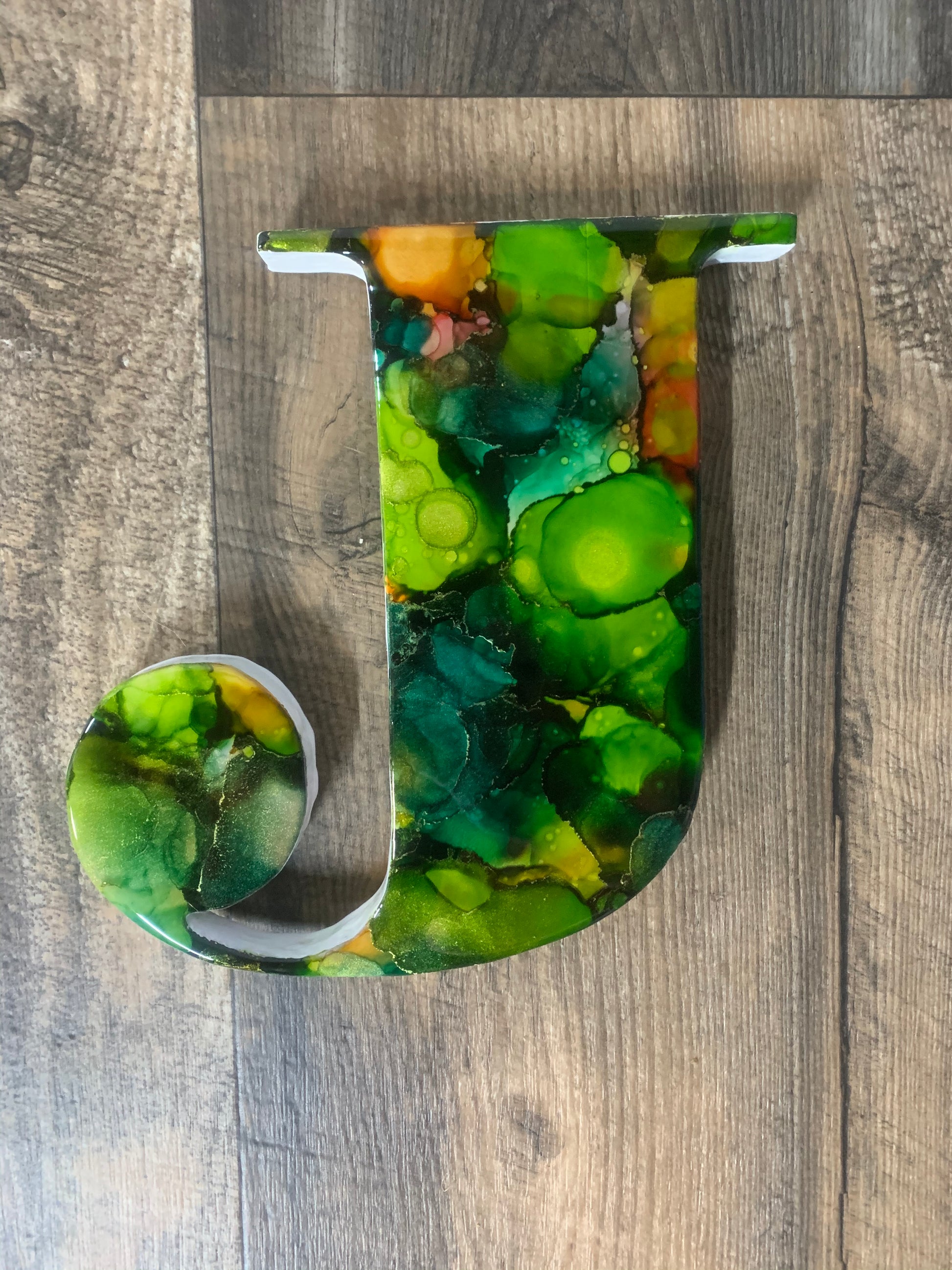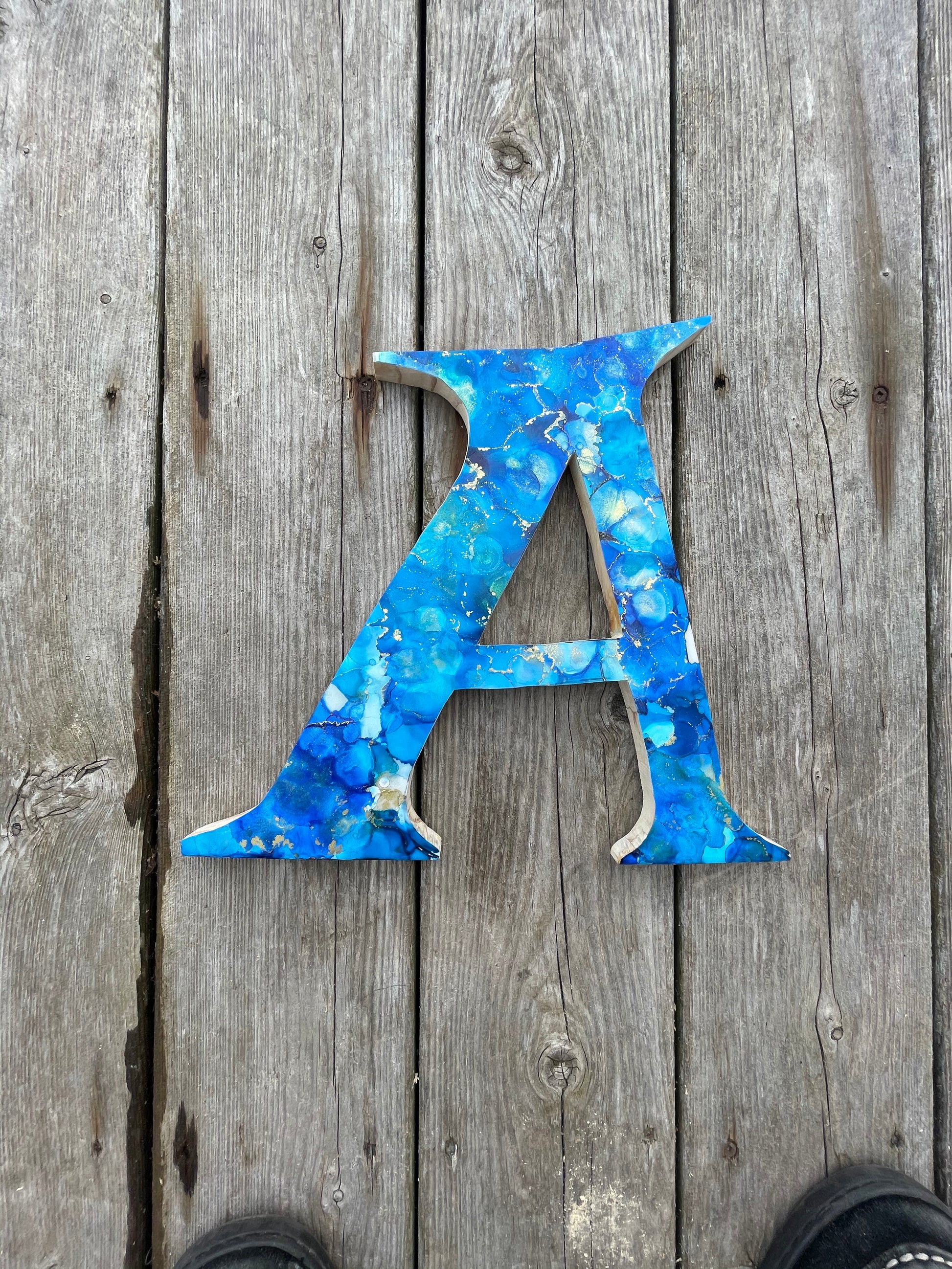 Letters are cut out using local wood. They are 10” tall and width is variable on the letter. White or black is the edging colour and alcohol inks are sealed and top coated with epoxy.