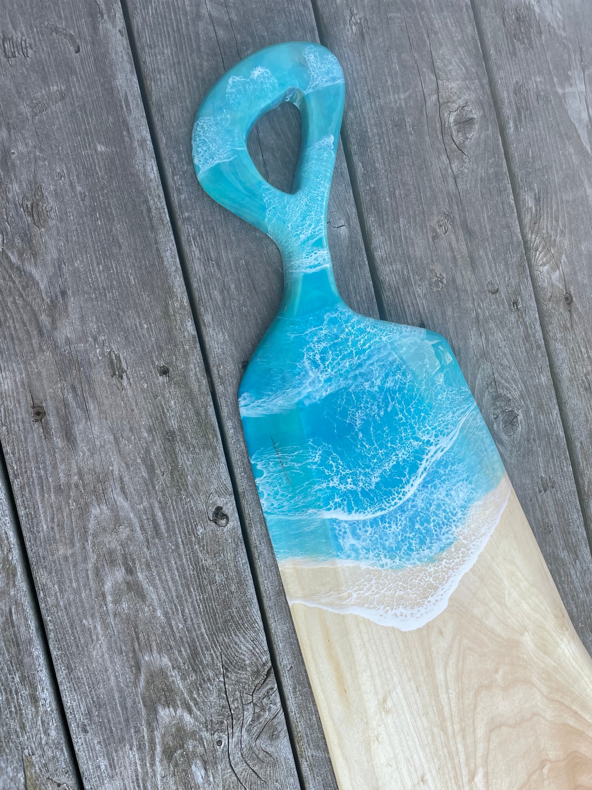 Large Maple Charcuterie with ocean epoxy accents and solid epoxy fill in the knot, the back of the board has a golden pearl fill in for the knot, this massive charcuterie board measures 38” in length and a live edge 12-9” live edge width.
