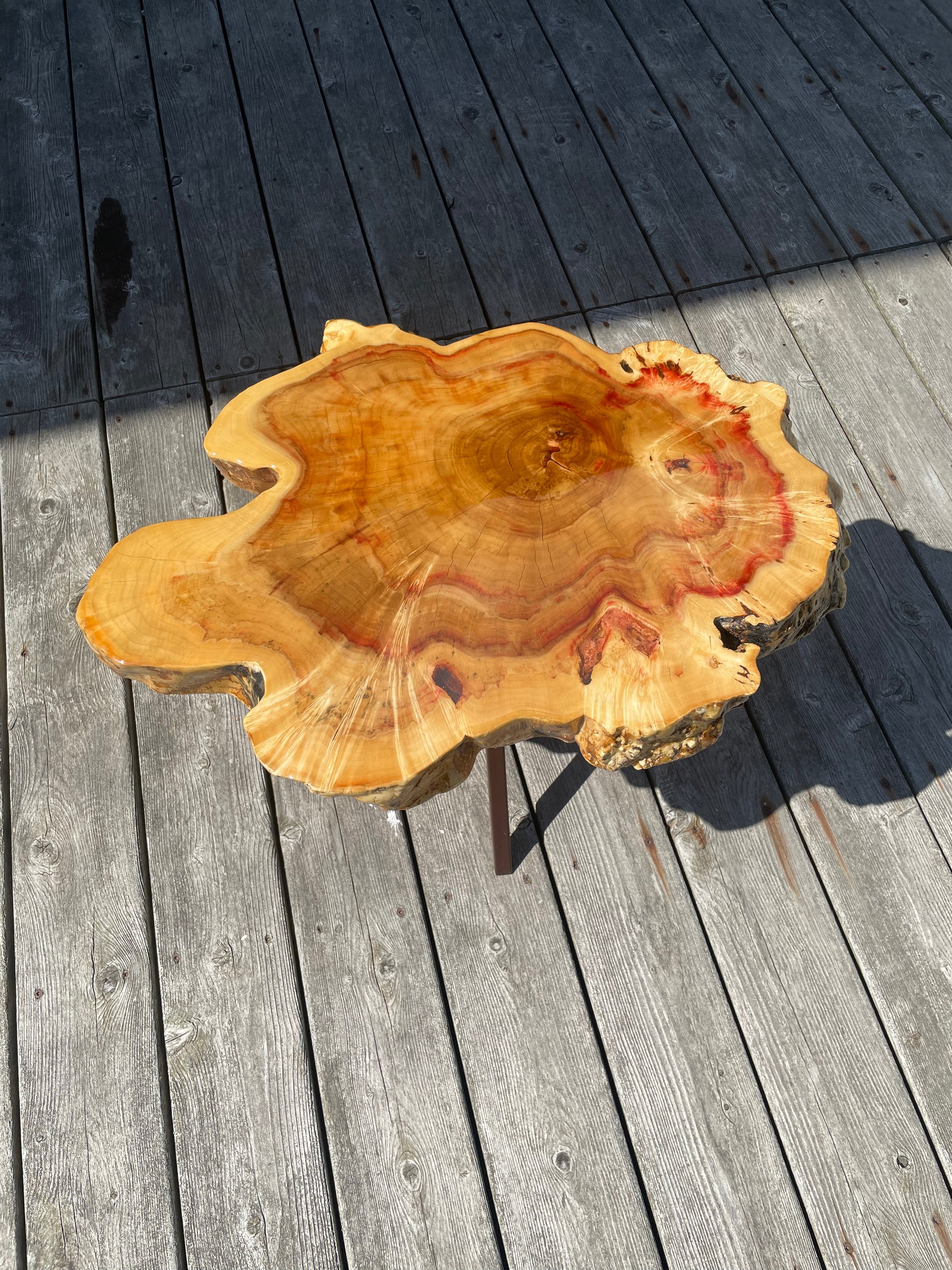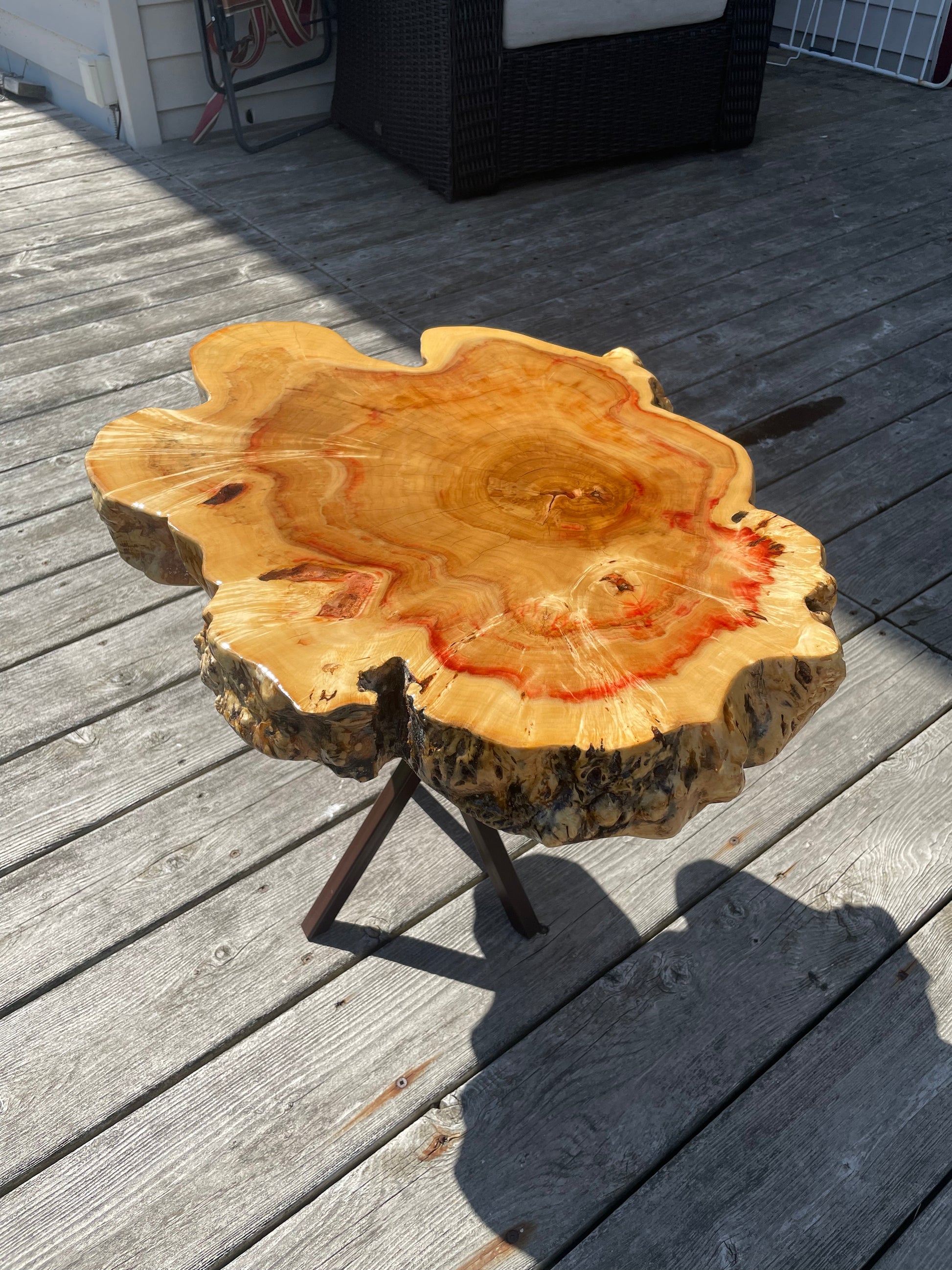 This stunning Manitoba maple cookie is a live edge 23” x 17” x 2.25” for an overall 17” height.