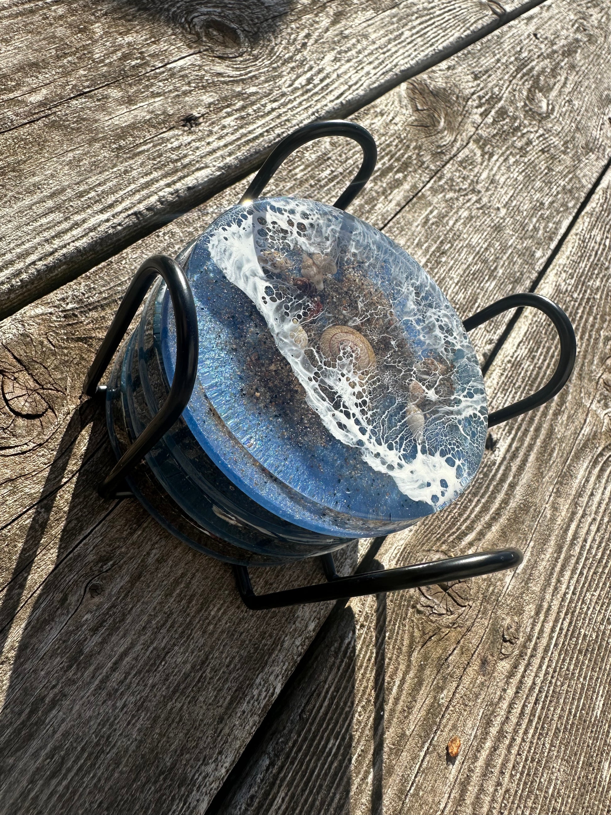 Cute Ocean coasters with a dark blue colour to accent the sand and shells. Set of 4