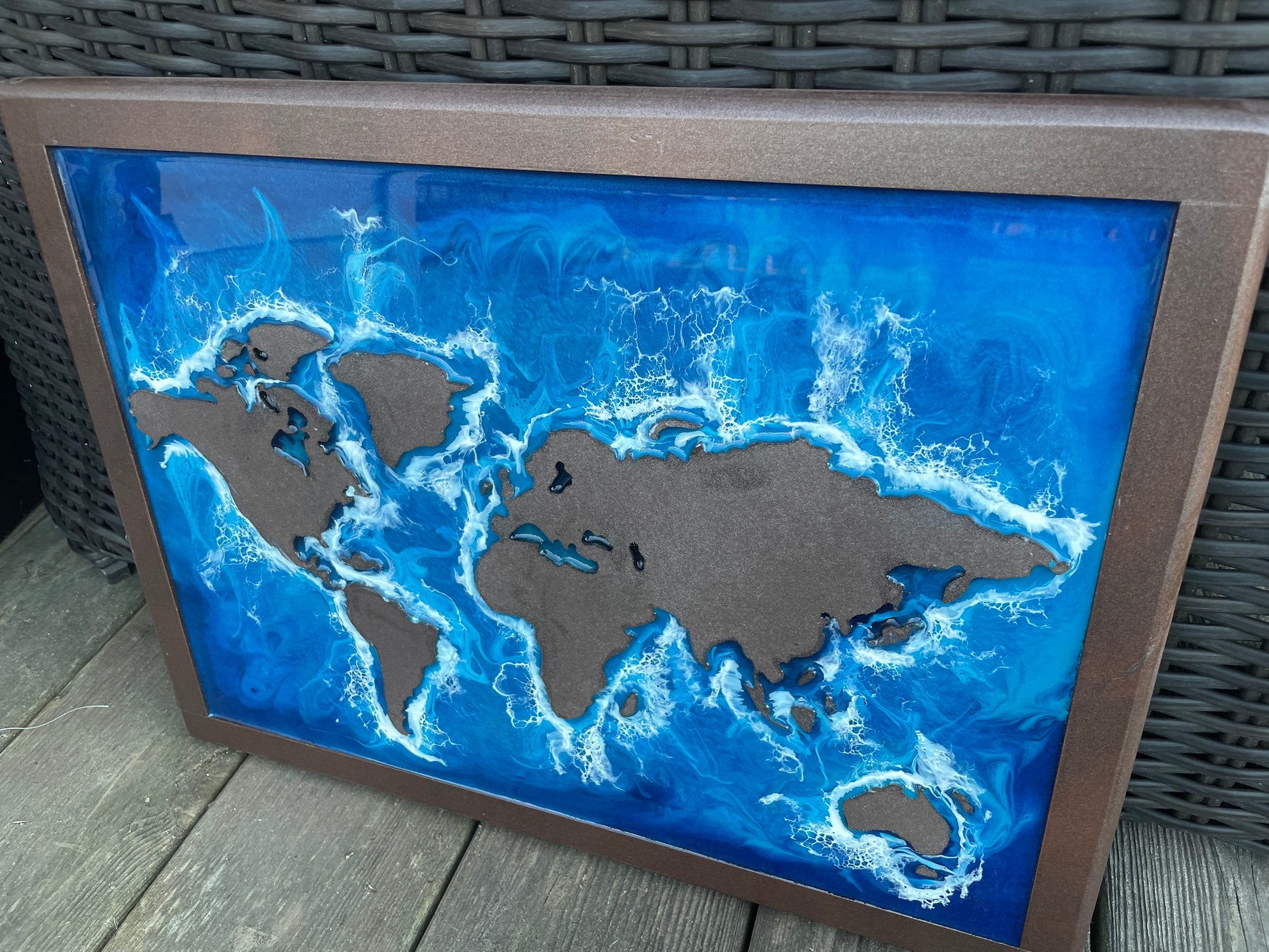 This world map is 18” x 13” with a painted metallic steel grey frame.