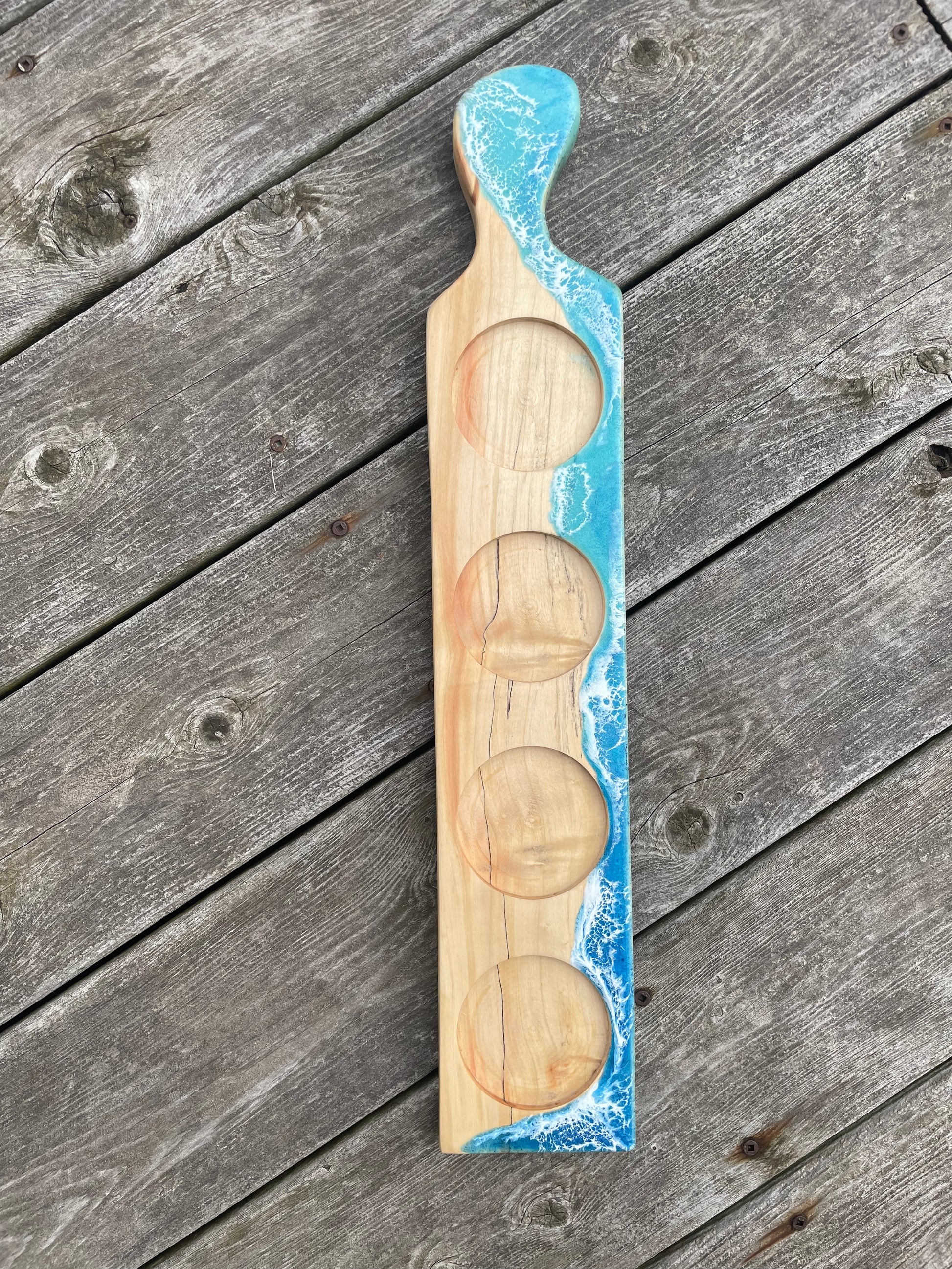 Beautiful Manitoba Maple turned into an elegant style beer flight. With ocean epoxy accents.
