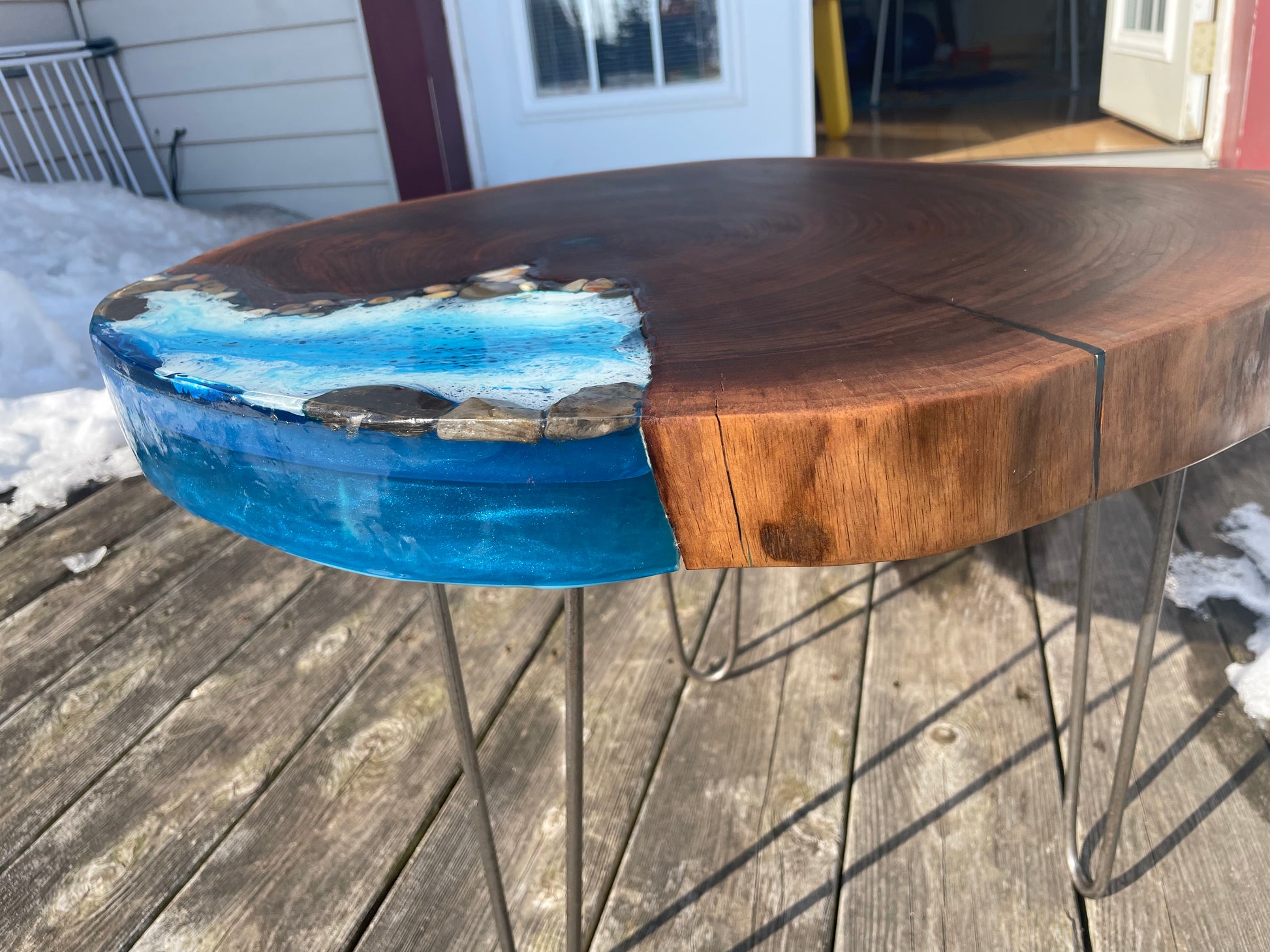 The stunning piece is a live edge cookies measuring 25”x21” the walnut top and epoxy is 2”thick and stands 16” tall on hair pin legs.