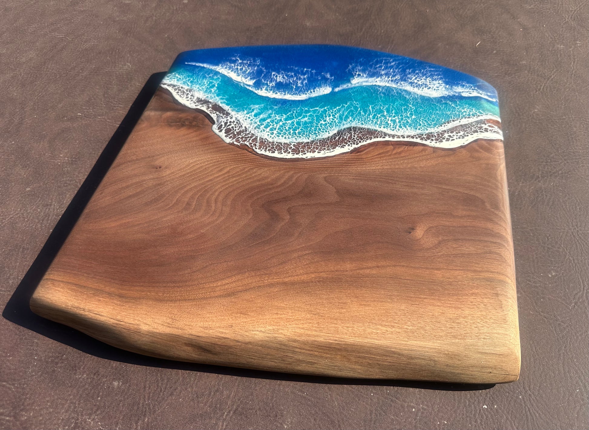 This beautiful walnut charcuterie board with beautiful ocean epoxy is ready to accent any charcuterie.