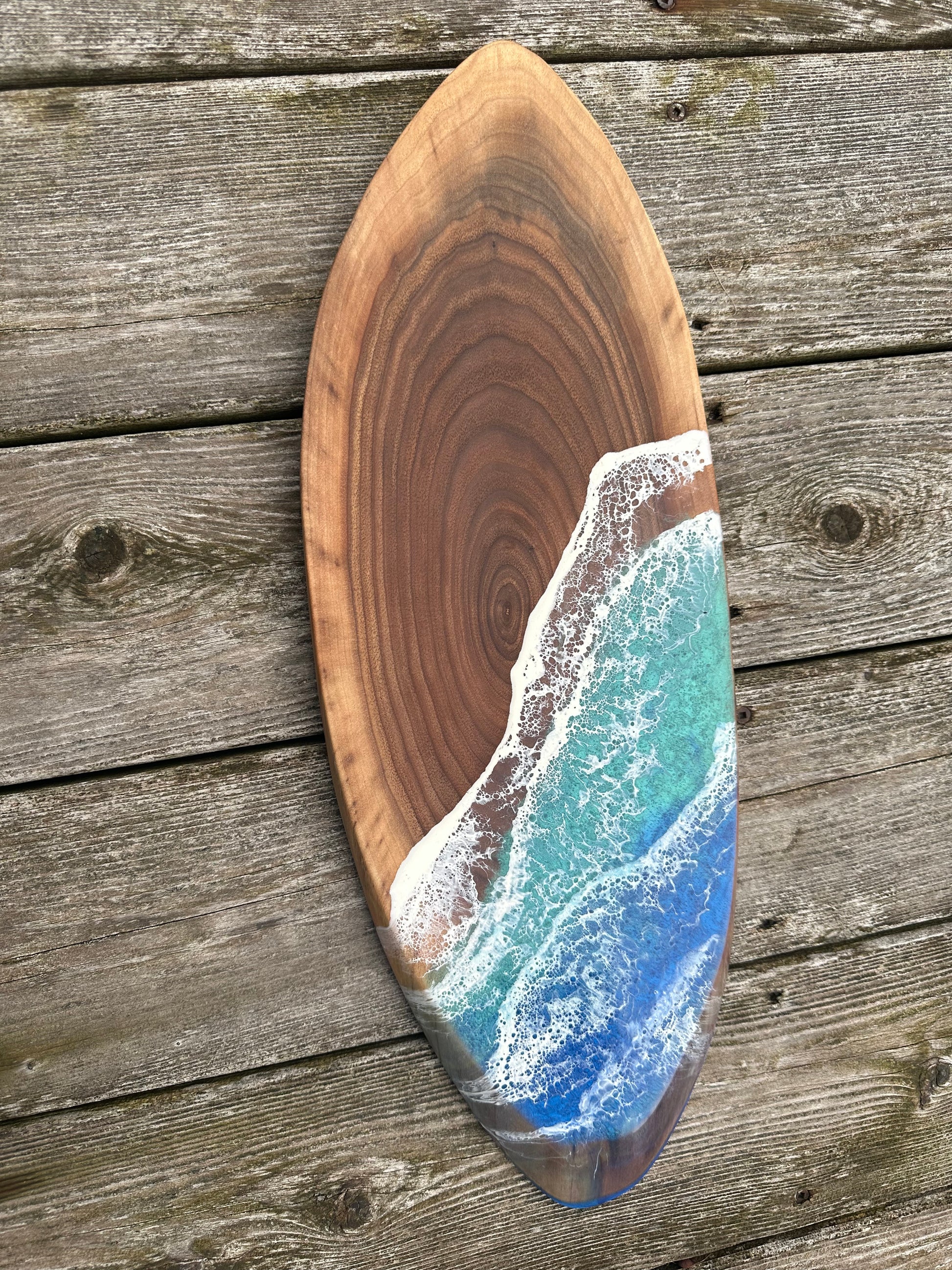 This beautiful end grain walnut oval cookie charcuterie has ocean epoxy accents and is ready to accent any charcuterie.